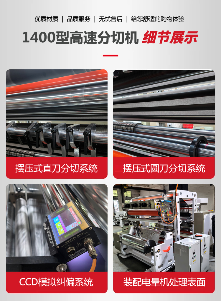 1400D4-2型電腦控制高速分切機,寬幅1400mm,分切速度350m/min,采用CCD模擬糾偏系統(tǒng),分切12u-50um卷筒類鐳射膜、鍍鋁膜、冷燙膜、電化品等塑料薄膜,配備擺壓式直刀和圓刀分切系統(tǒng),分切多種規(guī)格,具有自動化程度高,生產(chǎn)效率高,產(chǎn)品精度高,無劃傷等優(yōu)點。是一臺國內(nèi)高水平的分切專用設(shè)備。